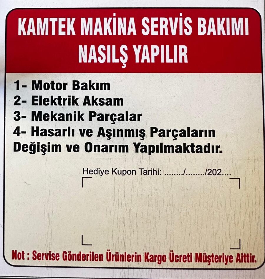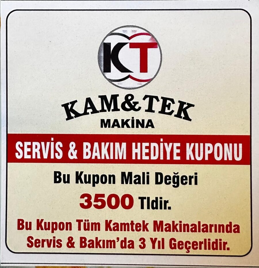 Kamtek Makina olarak sadece güçlü bir cihaz sunmakla kalmıyor, aynı zamanda kullanıcılarımızı da düşünüyoruz. Sektörde bir ilke imza atarak, tüm müşterilerimize 3.500 TL değerinde ücretsiz bakım ve servis kuponu hediye ediyoruz. Bu uygulamamızla, satış sonrası destek konusunda da yanınızda olduğumuzu gösteriyoruz.